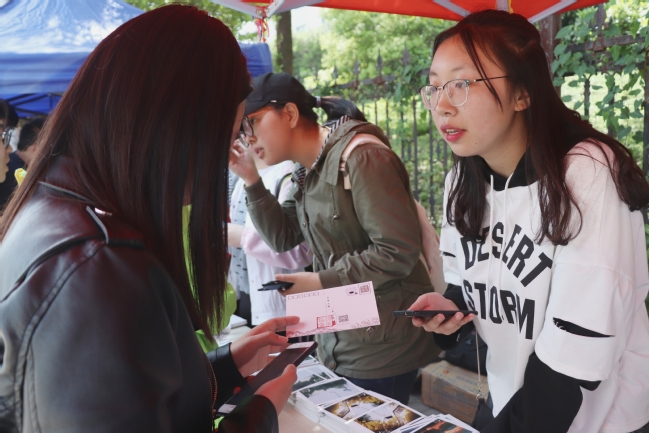 在活动开展期间,同学们纷纷踊跃参加,在印有校园风光的明信片上写下自己喜欢的书名或者感动的话,用不同的方式表达自己的思想。活动现场气氛热烈。同学们还可以通过扫描“神奇的二维码”录小视频、照片、声音的方式分享给远方的书友。此外,本次活动有专门的邮差寄出同学们的明信片,并且同学们也会收到来自百所高校学生的明信片。