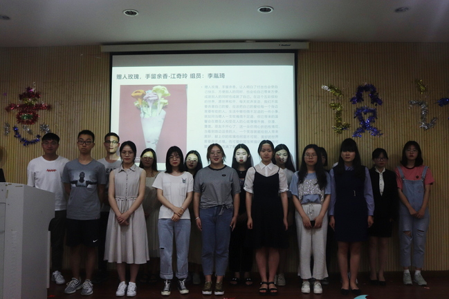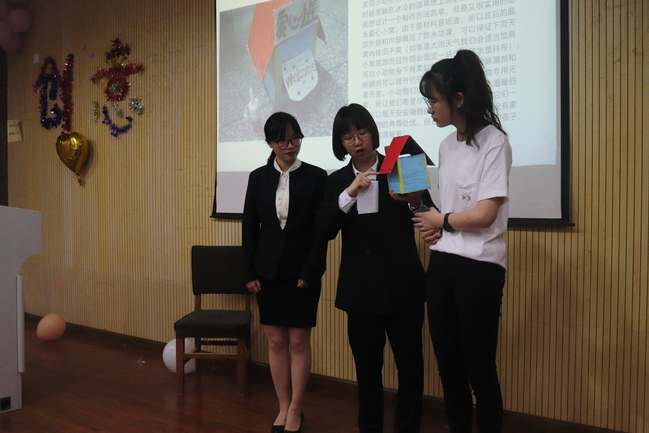 主持人介绍完毕后,比赛正式开始。第一位选手朱子琴带来的作品《Box of love》,用一卷卷纸条连在一起拼成一个爱心盒子,象征着我们每一个人应该心连心,尽自己的一份力将爱传递下去。第二位选手张乐童以及她的队员裴烨铃、何静蕾用纸盒制作出一个实用的防水爱心小窝,旨在为流浪小动物们带去一个温暖的家。第三位选手蒋悦向我们展示出她的作品《爱心围裙》,希望能为自己的母亲送去一份心意。第四位选手徐巧婷以及他的队员蒋烨成选用手绘T恤画的形式,带来他们的作品《成长·爱》,T恤的主体是一棵呈爱心形状的大树,象征着爱心会像参天大树一样,守护我们的世界。欣赏完四组选手的作品后,由爱心社手语部的干事为观众们带来中场表演《明天你好》。短暂的休息过后,比赛继续进行。第五位选手麻冬连选用闲置物品,通过自己的改造,制作出一份精美的参赛作品《“袋”上爱心》。这个作品属于废物利用,体现环保主题的同时还寓意着不管大爱还是小爱,只要人人心怀一些善意,社会就可以让爱飞翔。第六位选手张惠尔的作品《爱心礼盒》,大量的运用爱心元素,通过简单的拼接、粘贴,形成好玩有趣的图形。最后一组选手江奇玲和她的队友李胤琦,用一朵朵纸折的玫瑰花,带来她们的作品《赠人玫瑰,手留余香》。她们表示我们不要吝啬自己的爱,应该把爱传递给身边每一个需要帮助的人。为活跃气氛,比赛结束后还穿插了有趣的小游戏。