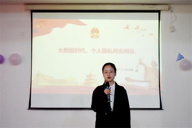 14日下午4时,活动正式开始,参赛者根据现场播放视频,快速回答主观题与选择题,经过激烈角逐,最终八人进入决赛。17日下午3时,决赛在大活舞厅正式打响。首先由工作人员介绍在场评委,并介绍比赛规则。八位选手自信满满,准备充分,制作的PPT内容严谨详实,设计新颖,将严肃的法律条文与生动的生活实例相结合,视频与图片贯穿始终。选手们的精彩表现赢得在场观众肯定,全场掌声不断,气氛热烈。最后,各位评委给予了专业、客观、公正的点评,并提供宝贵意见。
