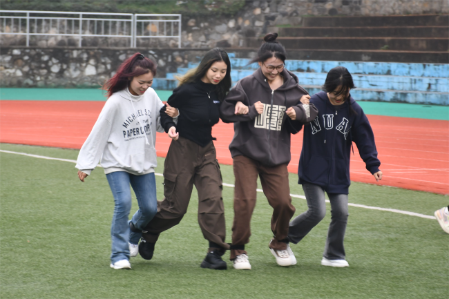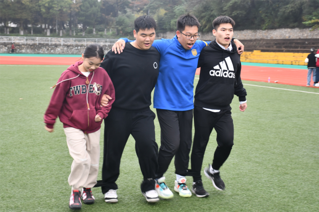 11月19日上午,“宣誓大暴走”活动的志愿誓师大会于文体馆进行。主持人首先向同学们介绍与会人员,随后,在领誓人的带领下,青年志愿者协会全体成员进行宣誓。下午,活动于操场正式举行。此次活动以小组为单位,共有五个项目组成,分别是:你比我猜、跳袋接力、四人五足、接力赛跑及撕名牌,依次完成五个项目且用时最短的小组获胜。活动过程中,同学们参与度极高,现场氛围活跃。