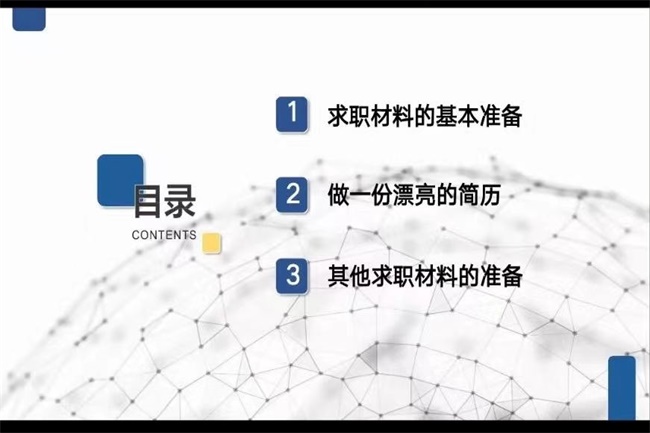 本次讲座共分为三个部分:求职资料的基本准备、做一份漂亮的简历、其他求职材料的准备。讲座伊始,王敏老师向同学们介绍本次讲座的目的及意义。接着,她从求职材料的基本组成、简历的制作技巧以及简历包含的内容等方面进行详细讲解,切实帮助同学们学习简历的制作。随后,王敏老师结合自身和他人的经历向同学们讲解如何制做一份漂亮的简历。最后,她向同学们补充说明其余求职材料的准备,并对此次讲座做总结,她希望同学们能够正确定位自己,制定计划,积极有效地利用大学时光,充实自己的大学生活。