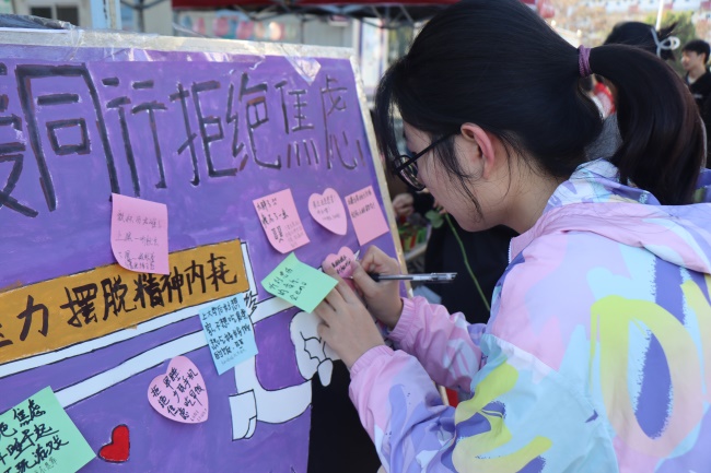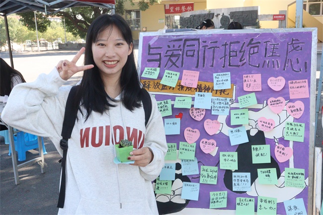 活动过程中,同学们将自己的烦恼和困惑写在便利贴上并贴于展板处,再由另一位同学对此进行回应及鼓励,由此形成烦恼的消解与正能量的传递。本活动以新颖别致的方式吸引了众多同学积极参与。