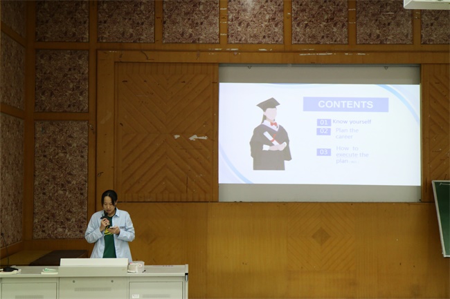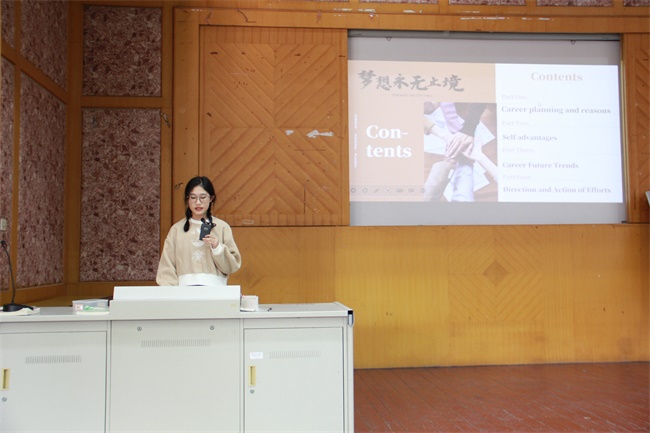 比赛活动分为两轮,第一轮参赛选手以时间为线索,通过讲解生涯彩虹图,引导选手对自己的过去现在以及未来进行总结和畅想。进入第二轮的同学以“英击职场,展望未来”为主题进行演讲,其中加入了英文自我介绍和个人职业生涯规划,个人演讲结束后,选手们抽取英文题目并作答。比赛期间,选手们流利的口语、清晰的规划,让现场观众赞叹。