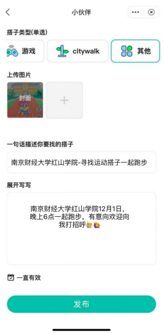 点击【领能量】按钮,选择【找搭子】任务项,发布寻找运动搭子帖,或向校内组队同学打招呼,共同完成运动打卡,记录运动日常。
