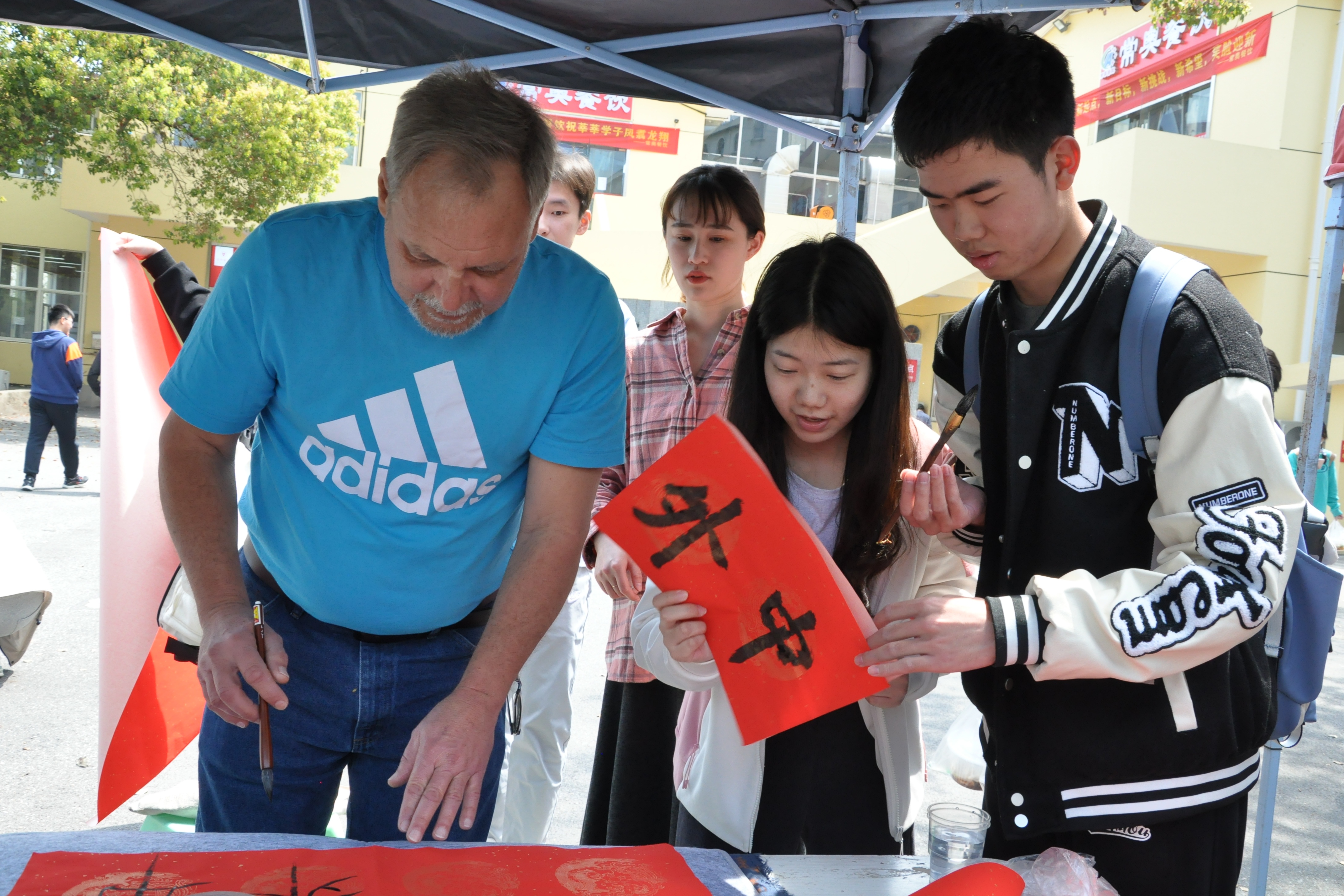 活动伊始,在指导老师的带领下,同学们有条不紊地开展本次征集活动。郭承波院长亲笔题字,拉开活动序幕。Thomas老师热情书写“中外交流”,体现中外友好往来。活动现场提供宣纸毛笔等工具供使用,同学们积极踊跃参与投稿,全神贯注地进行书画创作。