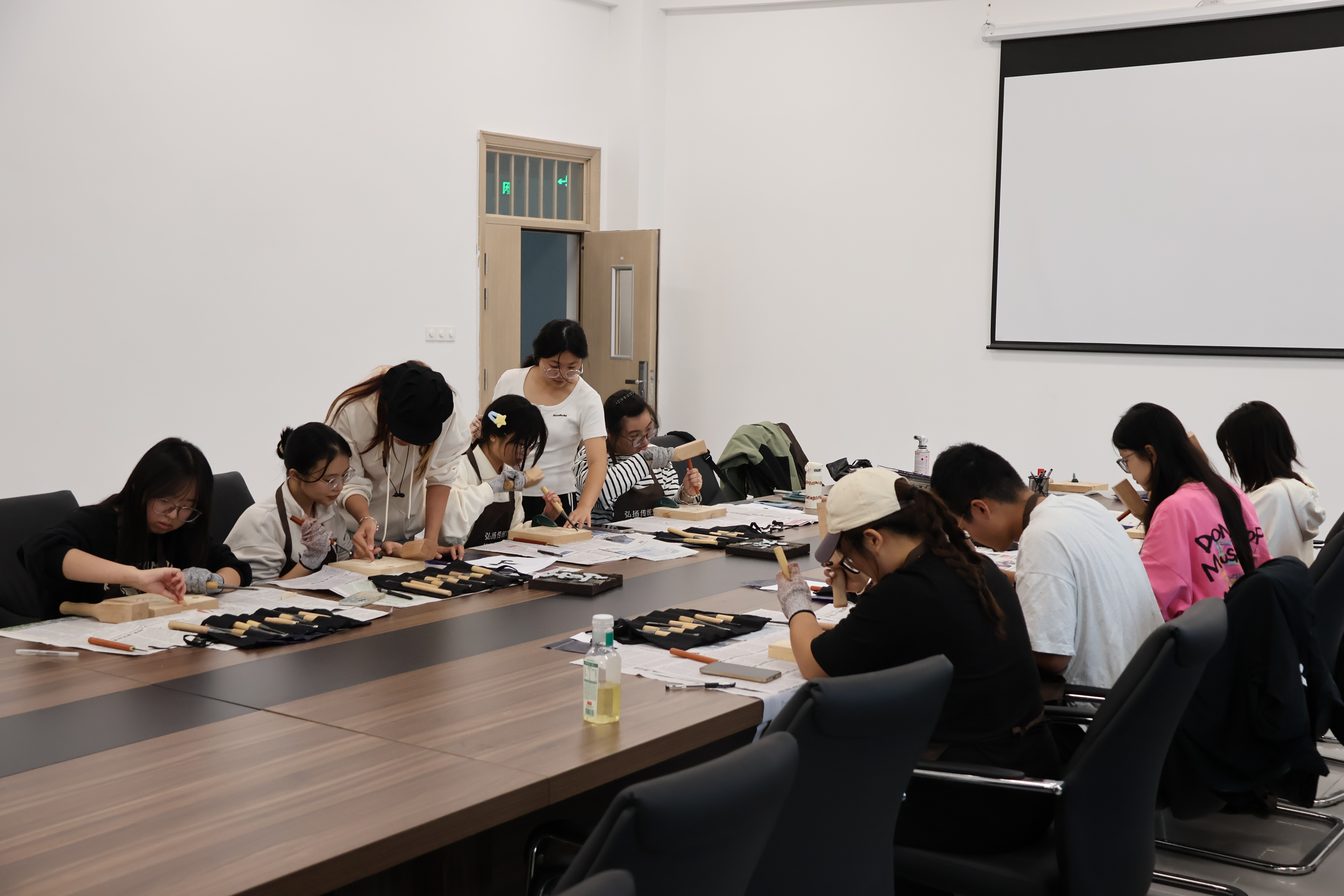 活动伊始,部长们为成员发放物料并讲解活动工具的使用方法及注意事项,同学们在部长的指导下专心致志的在木板上描摹汉字,一笔一划间将新奇连带着墨水一同融进木板中。收笔后,便进入既考验耐心又锻炼动手能力的木刻环节,同学们伏案认真实操,部长在其侧逐一指导帮助。一手持刀,一手握锤,在阵阵敲打声中汉字的线条逐渐显现。同学们认真雕刻,精心打磨自己的作品,一幅幅创意作品陆续完成。
