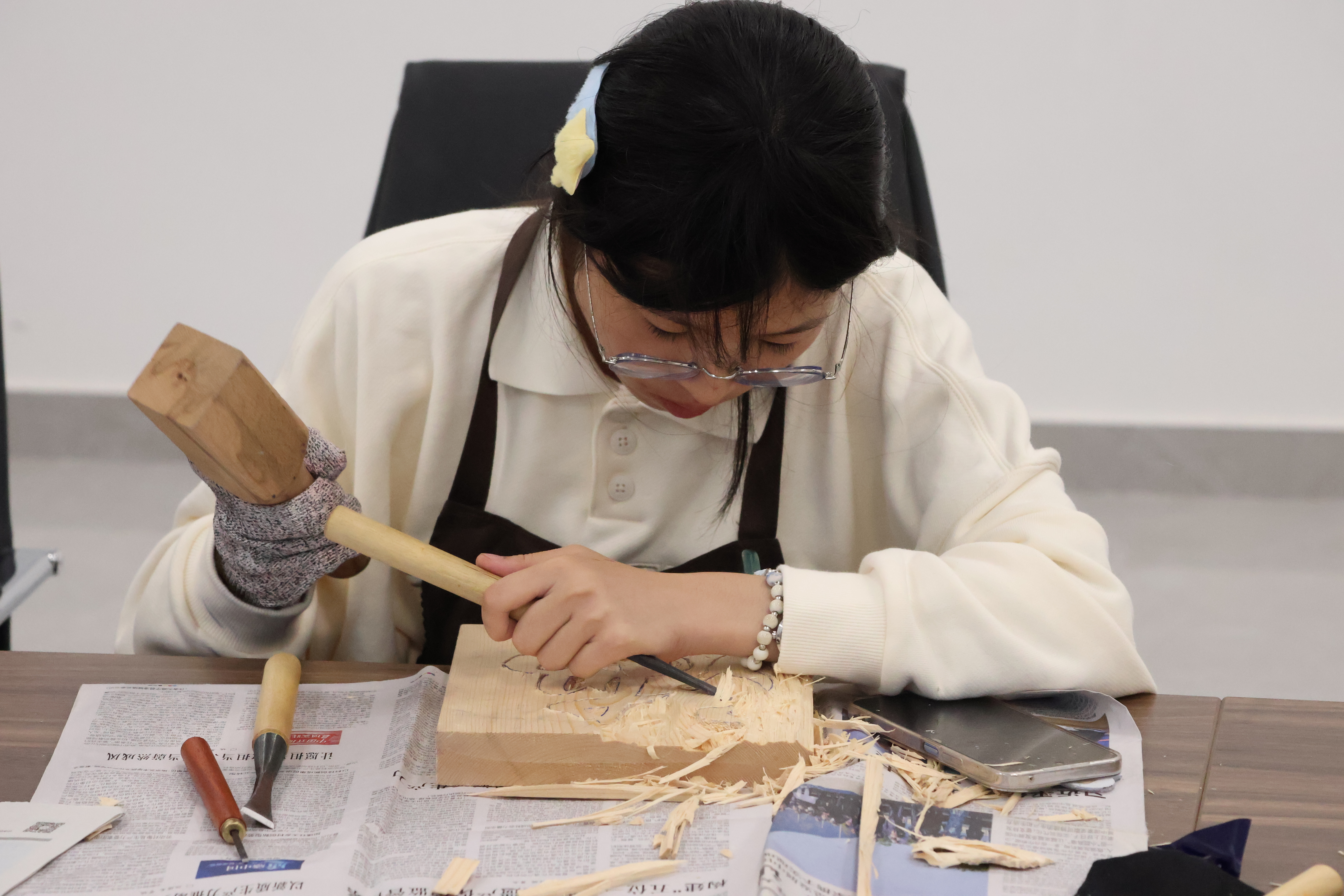 木雕实操让新生成员们直观感受到书刻“可变化、可创意、可融合”的魅力,丰富校园活动形式,同时,也在一定程度上推动着传统非遗文化的传播,将创意想法转化成动手实操,让木雕文化走进校园。