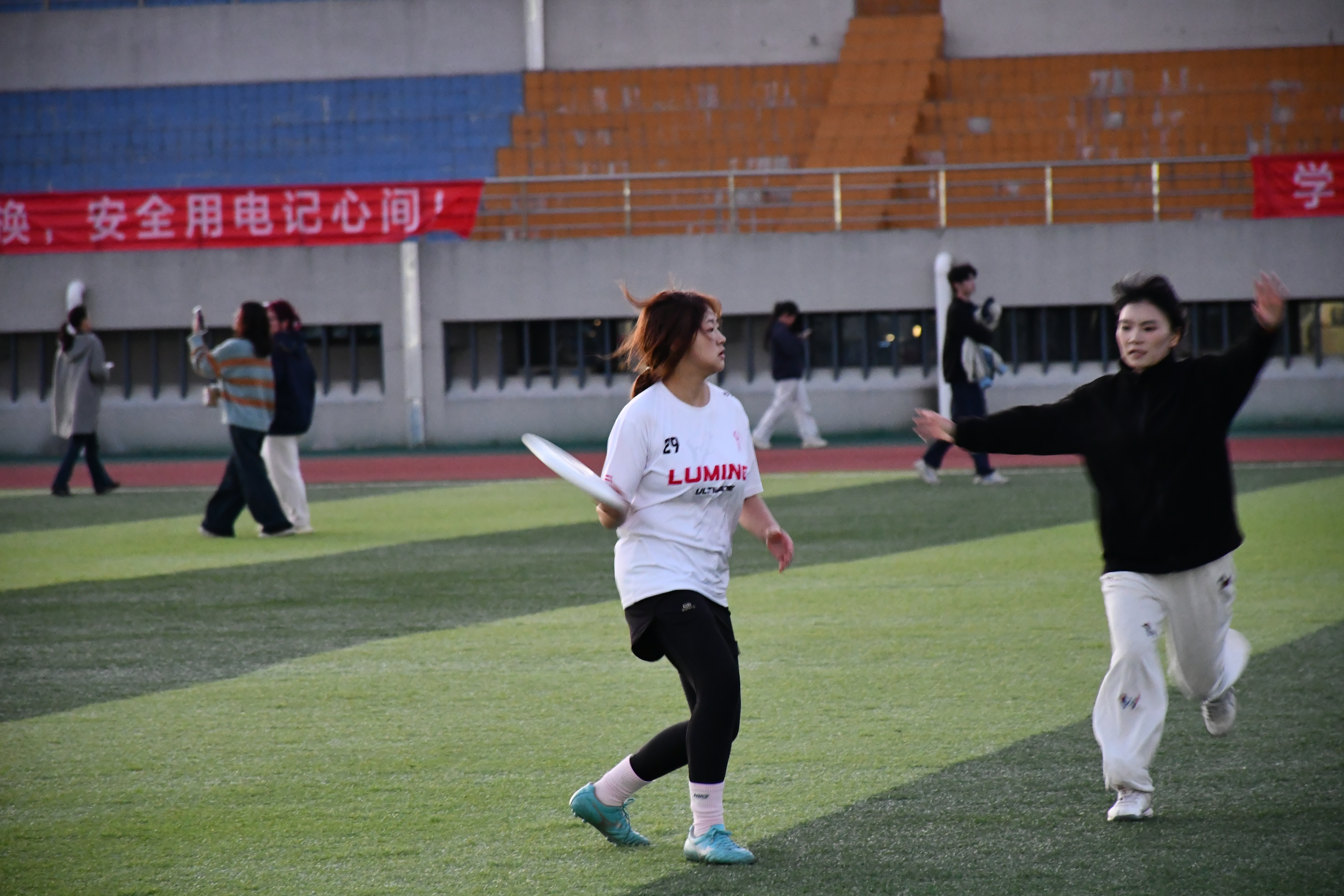 比赛采用“7v7”对抗形式,于操场两侧同时开赛。赛前,负责人为参赛选手讲解比赛规则,选手们充分热身完毕后,比赛正式拉开帷幕。赛场上,队员们奔跑、传接、飞扑,白色的飞盘在空中划出一道道优美的弧线,展现出较高的身体素质、精准的飞盘技术和快速的攻防转换,赢得场边观众的阵阵掌声。
