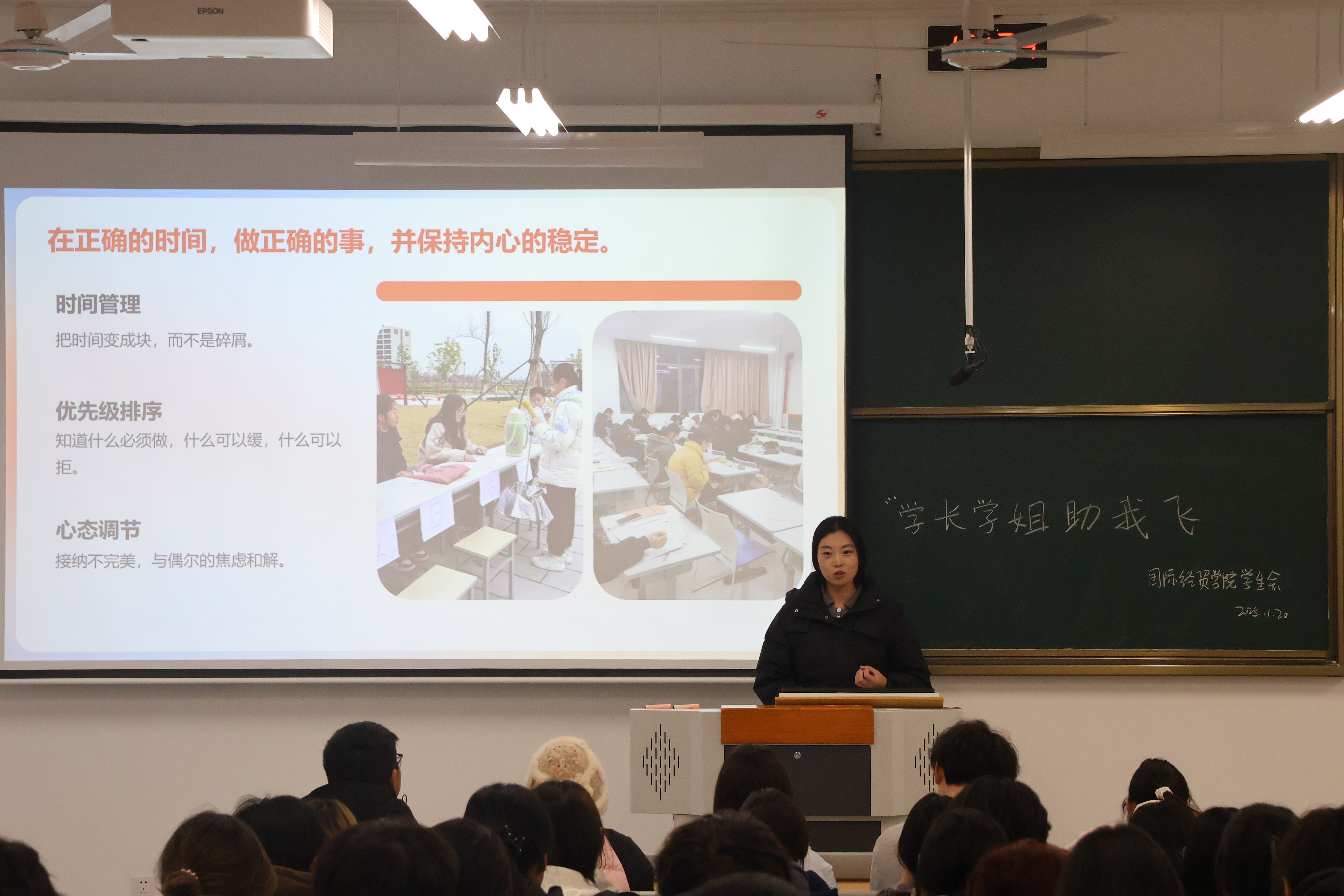 11月20日,国际经贸学院学生会在智圆A区104教室举办“学长学姐助我飞”活动。活动现场气氛热烈,同学们积极参与。