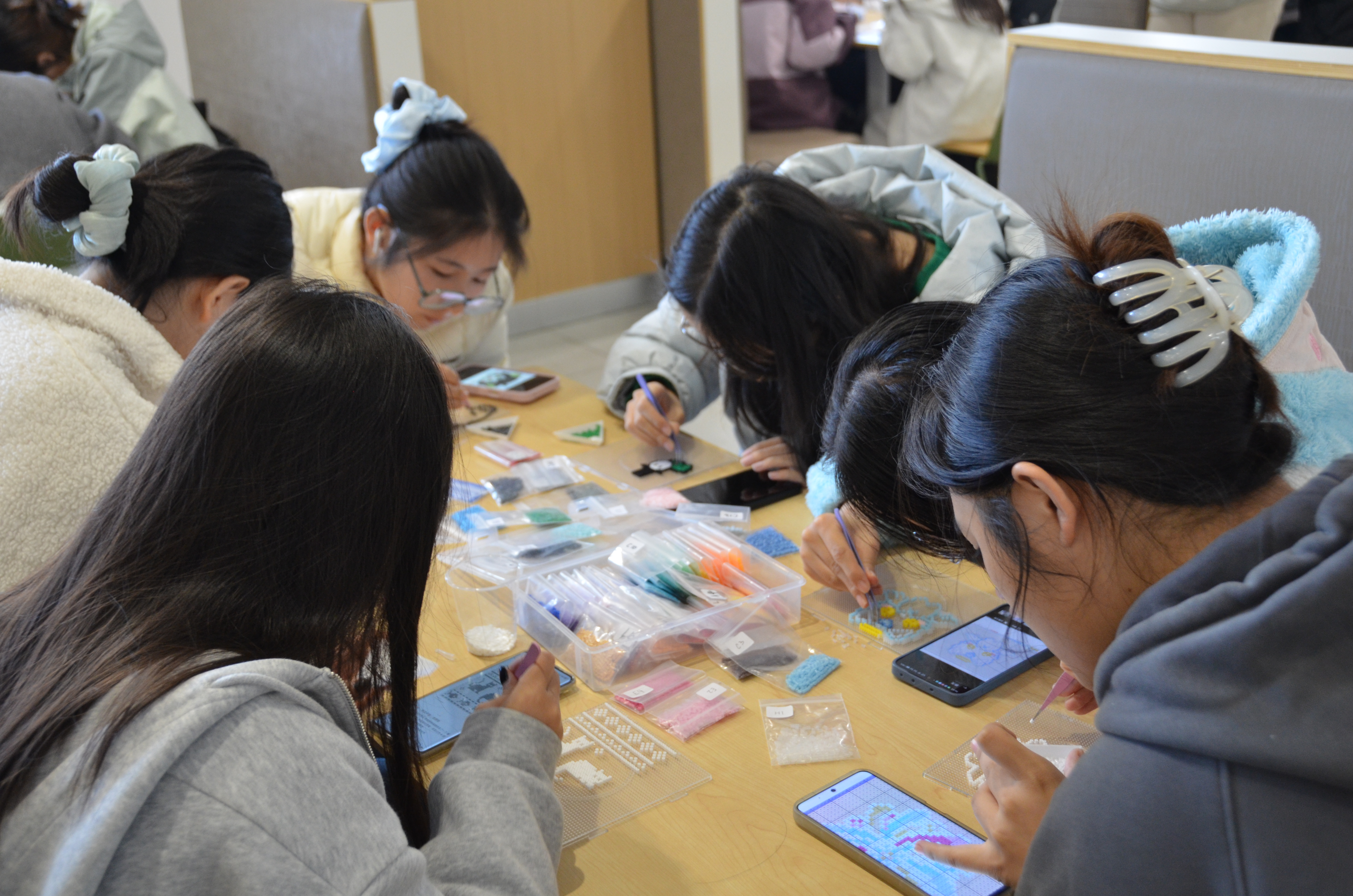 活动伊始,工作人员有序发放拼豆材料、模板及工具,为参与同学做好充足准备。期间,同学们在创作区域,或参照模板勾勒造型,或发挥创意自主设计,专注地将五彩拼豆逐一嵌入卡槽。创作过程中,大家相互交流技巧、分享灵感,现场氛围融洽,拍摄人员全程记录同学们的创作瞬间与精美作品,定格每份创意与喜悦。活动尾声,全体参与人员合影留念,负责人进行总结发言,对活动成效表示肯定并致谢所有参与者。