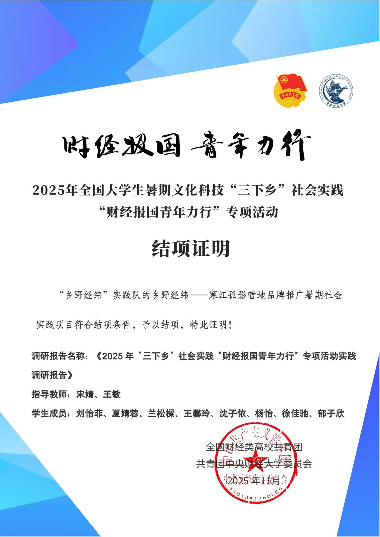 近日,我院乡野经纬社会实践团队在2025年全国大学生暑期“三下乡”社会实践系列活动中表现突出,荣获多项荣誉。团队成功入选团中央“千万工程”专项活动,成为全国132支完成实践并予以公示的团队之一;项目《寒江孤影营地品牌推广》在“财经报国青年力行”专项中通过审核并获结项证明;在第三届“两山杯”全国大学生乡村振兴创新创意创业大赛中,项目《乡野经纬》荣获创意赛道全国三等奖。
