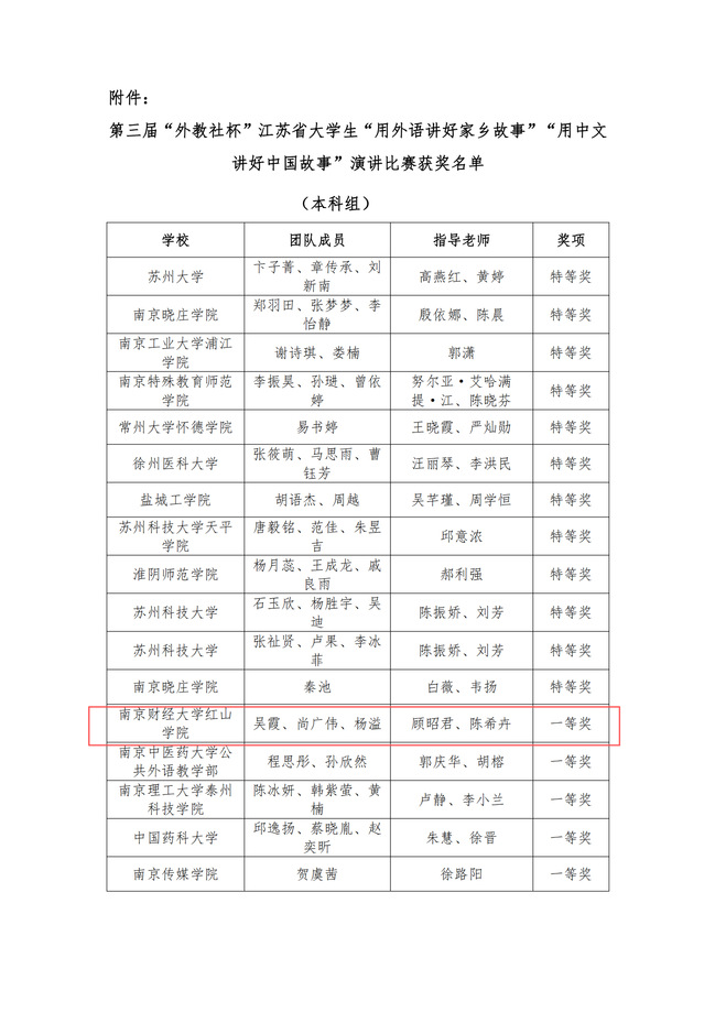 近日,由江苏省高等教育学会指导、江苏省高等学校外国语教学研究会、“学习强国”江苏学习平台、上海外语教育出版社主办,江苏经贸职业技术学院承办的第三届“外教社杯”江苏省大学生“用外语讲好家乡故事”“用中文讲好中国故事”演讲比赛圆满落幕。我院共有两支队伍突破重围,荣获一等奖。