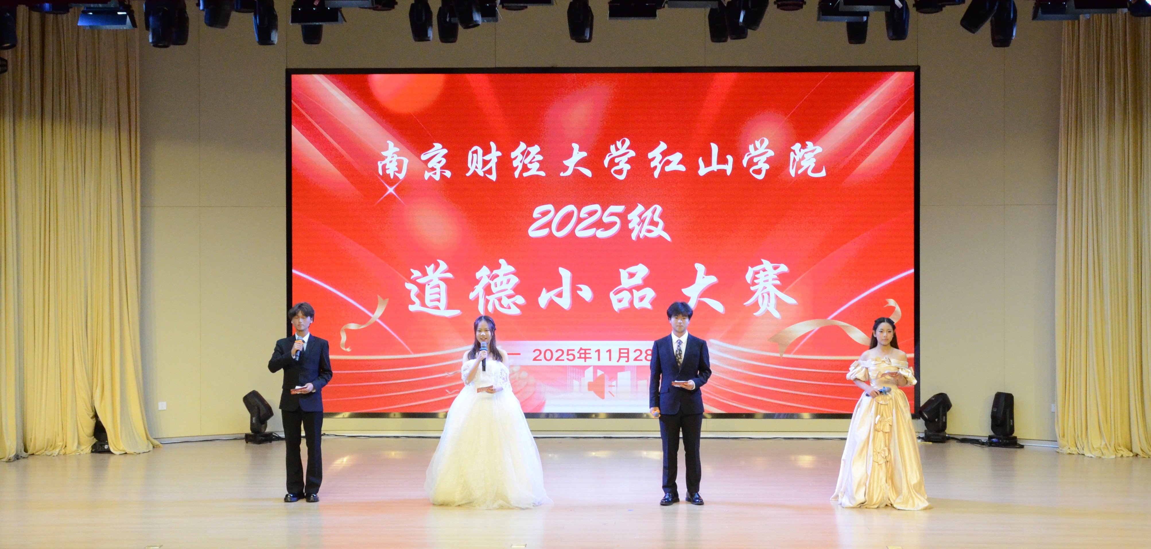11月28日,我院2025级大学生道德小品大赛决赛在鹿鸣剧院精彩上演。南京财经大学马克思主义学院副院长殷殷、原思想道德与法治教研部主任王桂玲,学院党委副书记高永东、马克思主义学院院长金怡顺、团委书记千继贤出席大赛。
