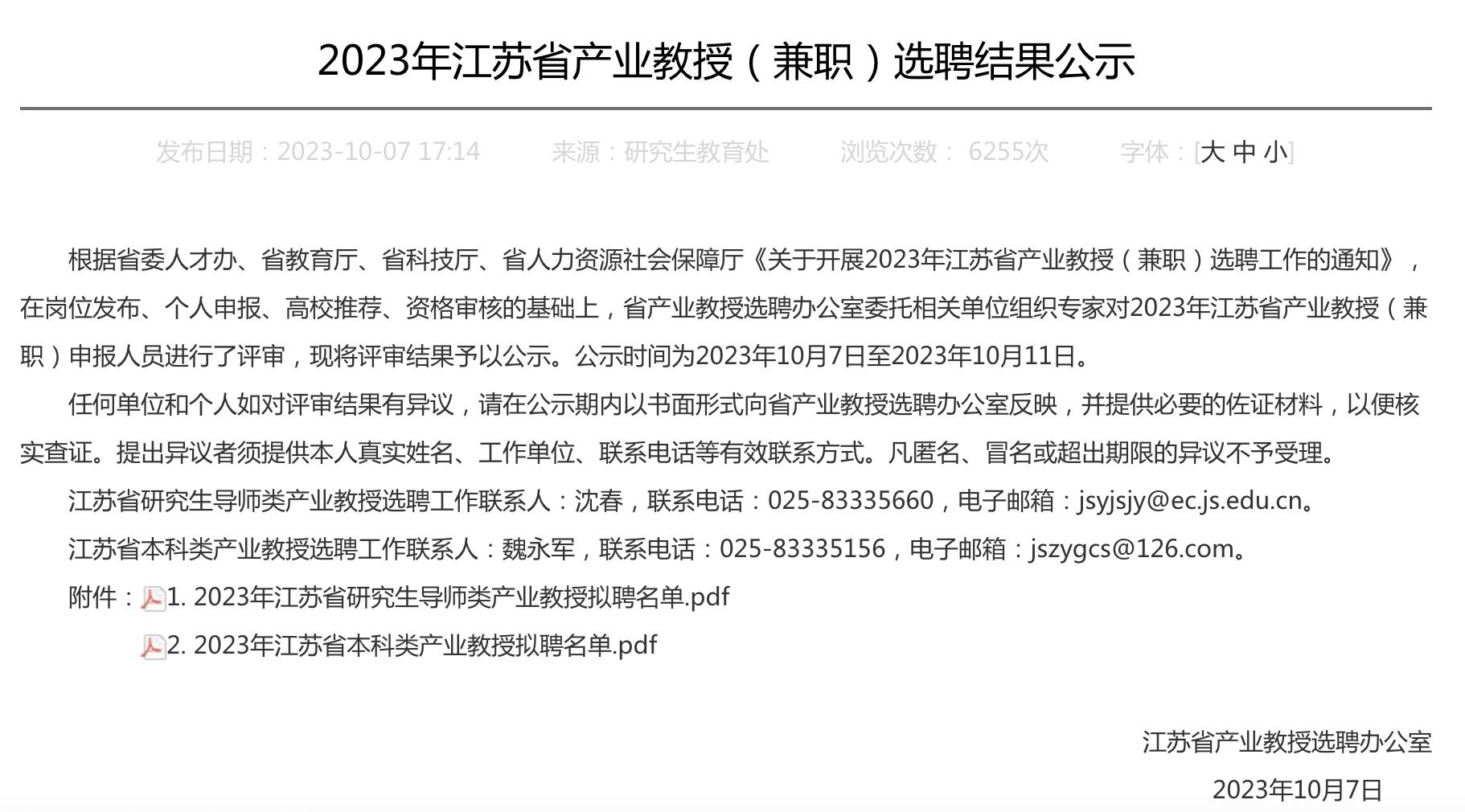 近日,江苏省产业教授选聘办公室公布了2023年江苏省产业教授(兼职)选聘结果。我院推荐的全拓科技(杭州)股份有限公司董事长崔永庆、天合光能股份有限公司副总裁凡金星2位科技企业家获批江苏省本科类产业教授。