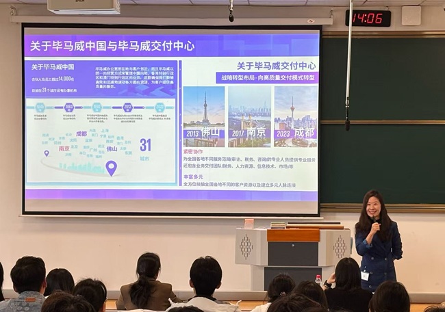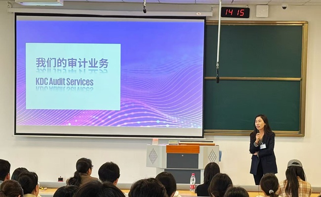 宣讲环节内容详实,干货满满。来自毕马威的三位企业代表分别从不同维度展开分享:王雯女士介绍了交付中心的核心特点,帮助学生建立初步认知;梁天玉女士梳理了中心的发展历程,展现其雄厚实力与广阔前景;徐钰女士则结合实战经验,深入解读了审计岗位的工作内容与职业价值。