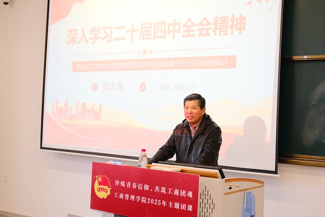 为深学细悟党的二十届四中全会精神,筑牢青年学子理想信念根基,12月3日下午,工商管理学院“淬炼青春信仰,共筑工商团魂”2025年度主题团课在启智1区205教室顺利开讲。工商管理学院党总支书记、院长张太海受邀主讲,党总支副书记王海萍,团总支书记何玉凤,团总支副书记张佳联,团组部门负责人,青璞砺行宣讲团成员,2025年春秋两季134名入团积极分子参加。本次团课由营销2451班辛晨主持。
