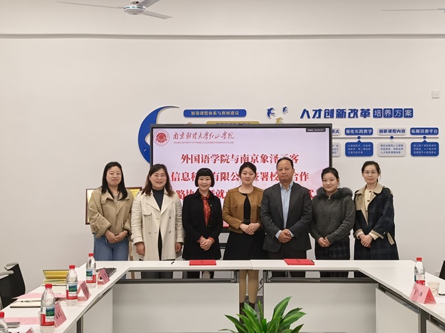 为深化产教融合,强化校企协同育人实效,搭建高质量实践教学与人才培养平台,4月16日下午,外国语学院与南京象泽云客信息科技有限公司校企合作战略协议签署暨就业实习基地授牌仪式在智圆楼B区329会议室顺利举行。南京象泽云客信息科技有限公司总经理吴丽萍、人事专员丁琳,学院党委副书记高永东,外国语学院院长肖辉,学工负责人何玉凤,团总支书记赵悌芳,教学秘书卞静参加。