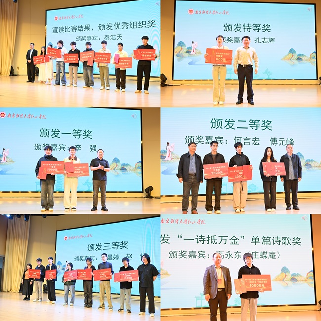 致辞结束,进入备受瞩目的颁奖环节。本次赛事自2025年10月启动以来,得到了全国各高校学子的积极响应,宣传覆盖近300家高校,127所高校文学社团组稿参赛,198家高校学生自由投稿,评委会严格遵循公平、公正、公开的原则,全程实行规范评审,最终评选出社团优秀组织奖10名、特等奖1名、一等奖2名、二等奖6名、三等奖10名及“一诗抵万金”单篇诗歌奖1名。当下语言工作室主编秦浩天,南京市高淳区政府党组成员、国际慢城管理办公室党组书记、主任孔志辉,南京高职园管委会主任李强,上海交通大学教授、博士生导师何言宏,南京大学教授、博士生导师傅元峰,南京财经大学红山学院党委副书记、副院长王晨婷,“媒体观察员”《杭州文学》杂志社主编赵哲,南京财经大学红山学院党委副书记高永东依次为各奖项获奖代表颁发荣誉证书与奖金,现场掌声雷动,既是对获奖学子创作成果的肯定,也是对所有青年诗歌爱好者的鼓励。镜头之下,一张张年轻的脸庞洋溢着对诗歌的赤诚与热爱,定格属于青春与文学的荣耀时刻。