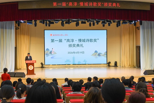 春和景明,诗风浩荡。4月19日,恰逢农历上巳节,第一届“高淳·慢城诗歌奖”颁奖典礼在我院鹿鸣剧场隆重举行。典礼汇聚了众多高校师生、诗歌爱好者及相关单位领导,以诗为媒,共赴一场兼具青春气息与文化底蕴的文学盛会,见证诗歌力量,共绘校地文化共建新图景。