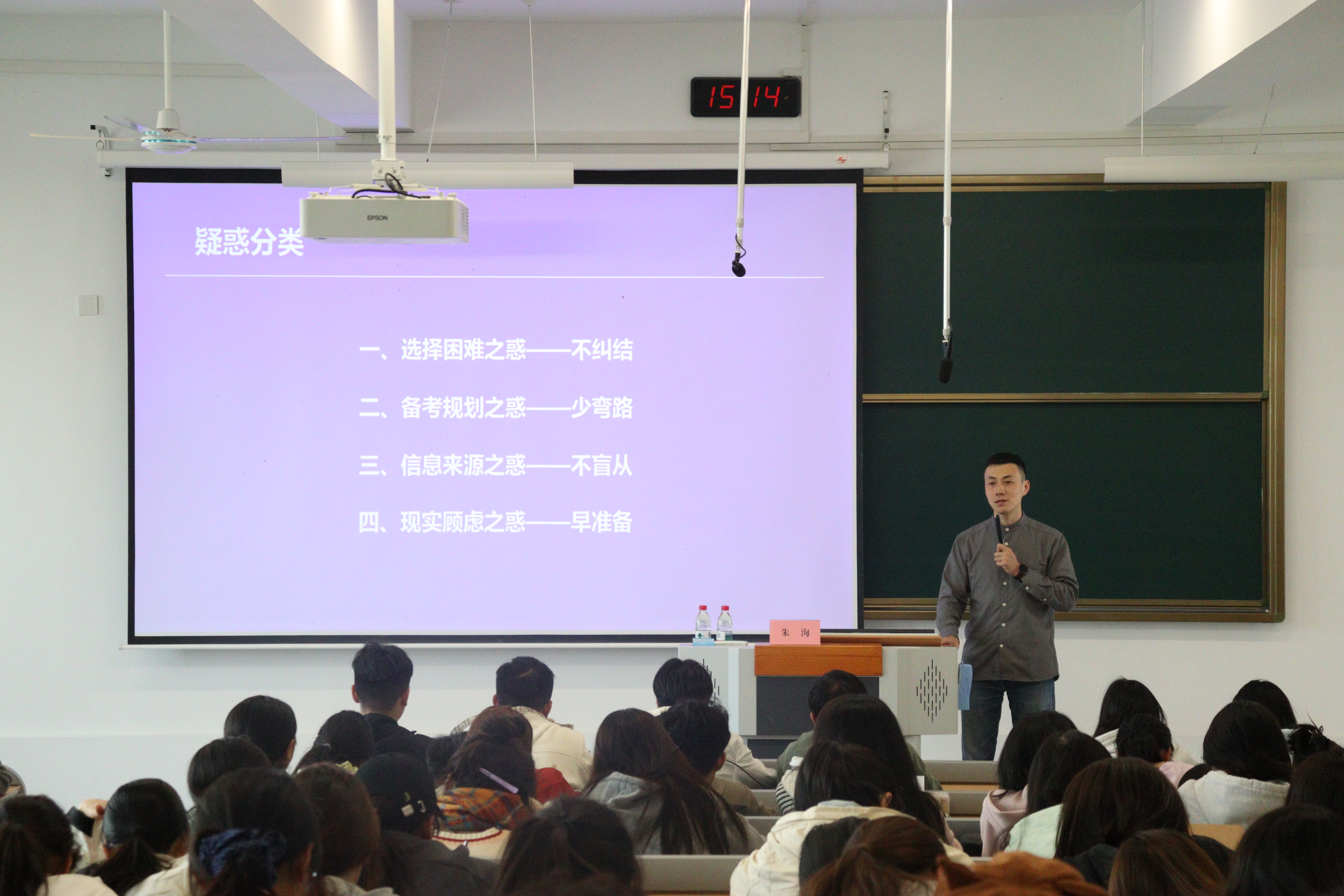 讲座中,规划师朱洵以高校毕业生就业趋势为引,凭借渊博的学识和生动的案例,从自我认知、环境分析、目标设定到行动计划等多个维度,细致分析考研及就业的利弊,帮助同学们明确对未来方向的选择。整场讲座内容既“干货满满”,又“打动人心”,引导同学们深刻认识到科学规划对于个人发展的重要性。他还寄语同学们要提前“布局”职业生涯,避免盲目“试错”。